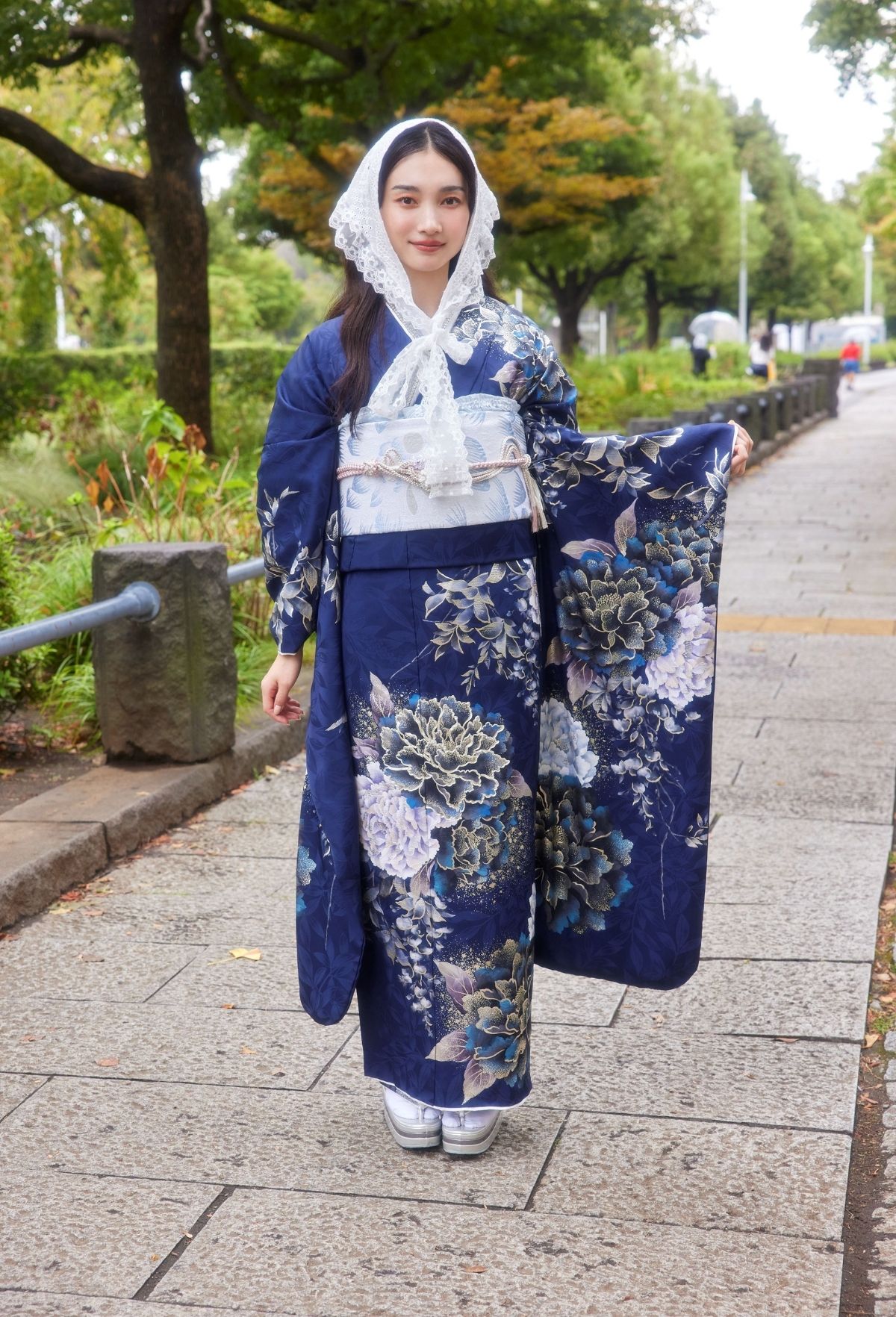 紺地に咲き誇る金彩牡丹が個性と華やかさを演出