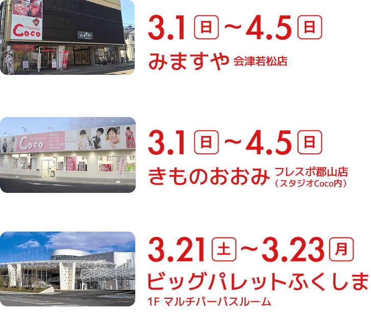 ご希望の会場をお選びください みますや 会津若松店 福島県会津若松市本町8-14 きものおおみ フレスポ郡山店 福島県郡山市南2-25フレスポ郡山下棟 ビッグパレットふくしま 1F マルチパーパスルーム 福島県郡山市南2-52 ご希望の日程をお選びください ご希望の日程必須 選択してください 03月21日(土) 03月22日(日) 03月23日(月) 選択してください 03月02日(月) 03月03日(火) 03月05日(木) 03月06日(金) 03月07日(土) 03月08日(日) 03月09日(月) 03月10日(火) 03月12日(木) 03月13日(金) 03月14日(土) 03月15日(日) 03月16日(月) 03月17日(火) 03月19日(木) 03月20日(金) 03月24日(火) 03月26日(木) 03月27日(金) 03月28日(土) 03月29日(日) 03月30日(月) 03月31日(火) 04月02日(木) 04月03日(金) 04月04日(土) 04月05日(日) 選択してください 03月02日(月) 03月03日(火) 03月05日(木) 03月06日(金) 03月07日(土) 03月08日(日) 03月09日(月) 03月10日(火) 03月12日(木) 03月13日(金) 03月14日(土) 03月15日(日) 03月16日(月) 03月17日(火) 03月19日(木) 03月20日(金) 03月21日(土) 03月22日(日) 03月23日(月) 03月24日(火) 03月26日(木) 03月27日(金) 03月28日(土) 03月29日(日) 03月30日(月) 03月31日(火) 04月02日(木) 04月03日(金) 04月04日(土) 04月05日(日) ご希望の時間帯必須 選択してください お客様情報をご入力ください お嬢様名必須 お嬢様名(ふりがな)任意 住所任意 メールアドレス必須 電話番号必須 生年月日必須 -- 2026 2025 2024 2023 2022 2021 2020 2019 2018 2017 2016 2015 2014 2013 2012 2011 2010 2009 2008 2007 2006 2005 2004 2003 2002 2001 2000 1999 1998 1997 1996 1995 1994 1993 1992 1991 1990 1989 1988 1987 1986 1985 1984 1983 1982 1981 1980 1979 1978 1977 1976 1975 1974 1973 1972 1971 1970 1969 1968 1967 1966 1965 1964 1963 1962 1961 1960 1959 1958 1957 1956 1955 1954 1953 1952 1951 1950 1949 1948 1947 1946 1945 1944 1943 1942 1941 1940 1939 1938 1937 1936 1935 1934 1933 1932 1931 1930 1929 1928 1927 年 -- 1 2 3 4 5 6 7 8 9 10 11 12 月 -- 1 2 3 4 5 6 7 8 9 10 11 12 13 14 15 16 17 18 19 20 21 22 23 24 25 26 27 28 29 30 31 日 ご検討中のプラン任意 振袖レンタルプラン 振袖購入プラン ママ振・姉振プラン お問い合わせ内容任意 送信内容の確認へ